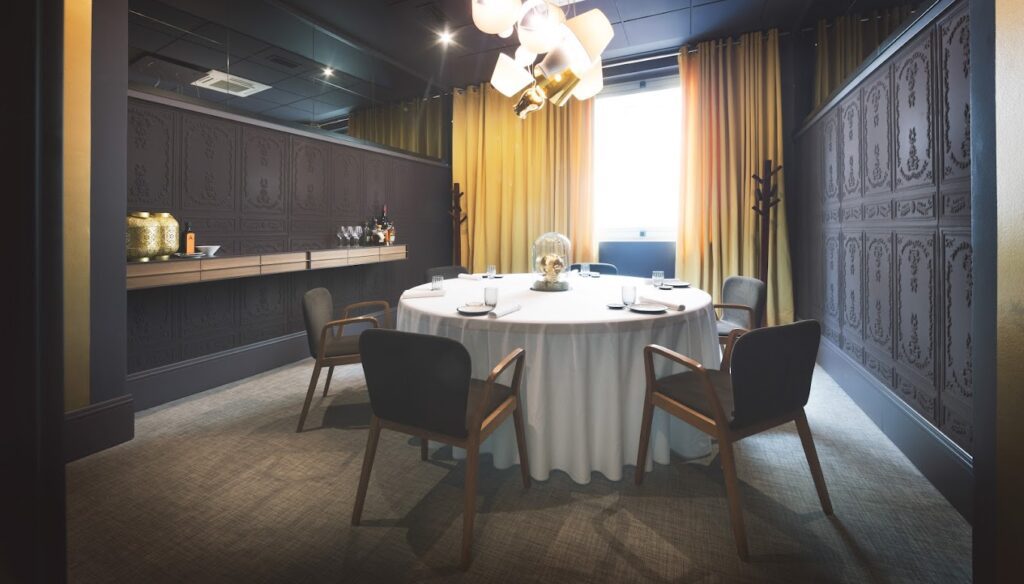 Sala moderna con diseños de pared extravagantes que ofrece menús degustación locales y elegantes con maridajes de vinos.